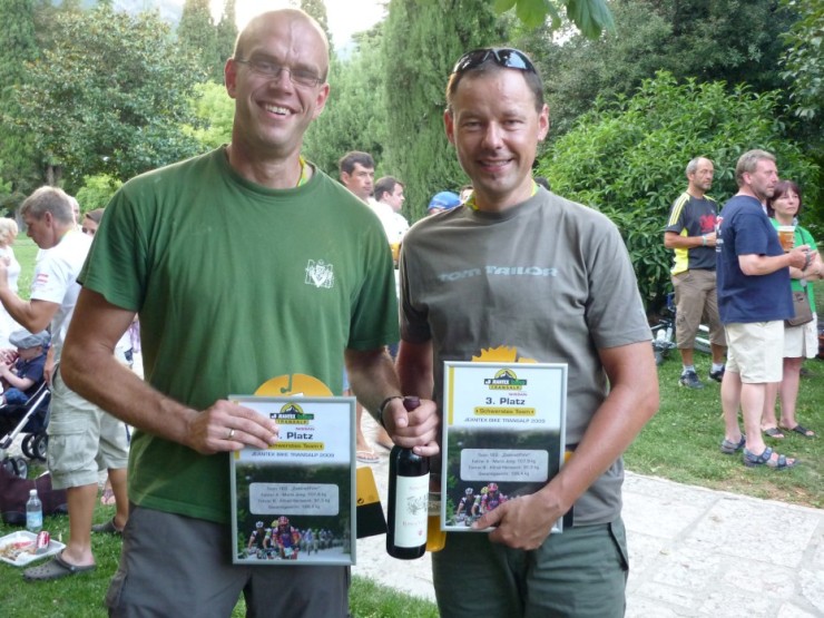 Bei der Pasta Party gab es neben Nudeln auch ½ Hähnchen und Pommes. Es war sehr lecker. Anschließend gingen wir zum Strand und genossen die Aussicht auf den See. Als wir zurück zur Party gingen, kamen wir gerade noch rechtzeitig um auf die Bühne gerufen zu werden, weil wir den 3. Platz beim Schwersten Team der Transalp gewonnen hatten.