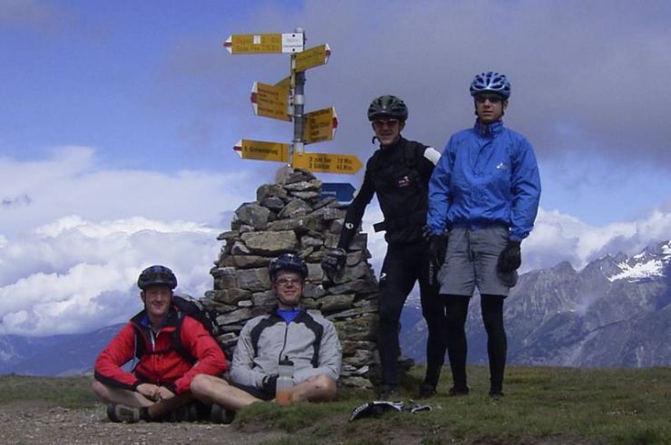 Die Abfahrt war einfach und nach 10 Min leider schon vorbei. Thomas stürzte weil eine fast unsichtbare Leine über dem Weg gespannt war. Danach ging es wieder aufwärts Richtung Bistinepass auf 2400m. Laut Achim Zahn ist der Anstieg komplett fahrbar, aber die Steilheit und der lose Untergrund zwangen mich + Karl einen Großteil zu schieben. Carsten + Thomas sind fast komplett durchgefahren, super Leistung. Beim Aufstieg waren mal wieder 2-3 Schneefelder zu passieren. Der Gipfel war aber relativ leicht zu ereichen. Die Abfahrt auf der anderen Seite war super, technisch anspruchsvoll aber alles fahrbar. Das war die beste Abfahrt des gesamten Crosses. Dieses Mal hatte Thomas einen kleinen technischen Defekt: Eine Speiche des Hinterrades ist gebrochen. Da der Cross aber schon fast vorbei ist hat Thomas die Speiche entfernt und ist mit einem kleinen Achter im Hinterrad weitergefahren.